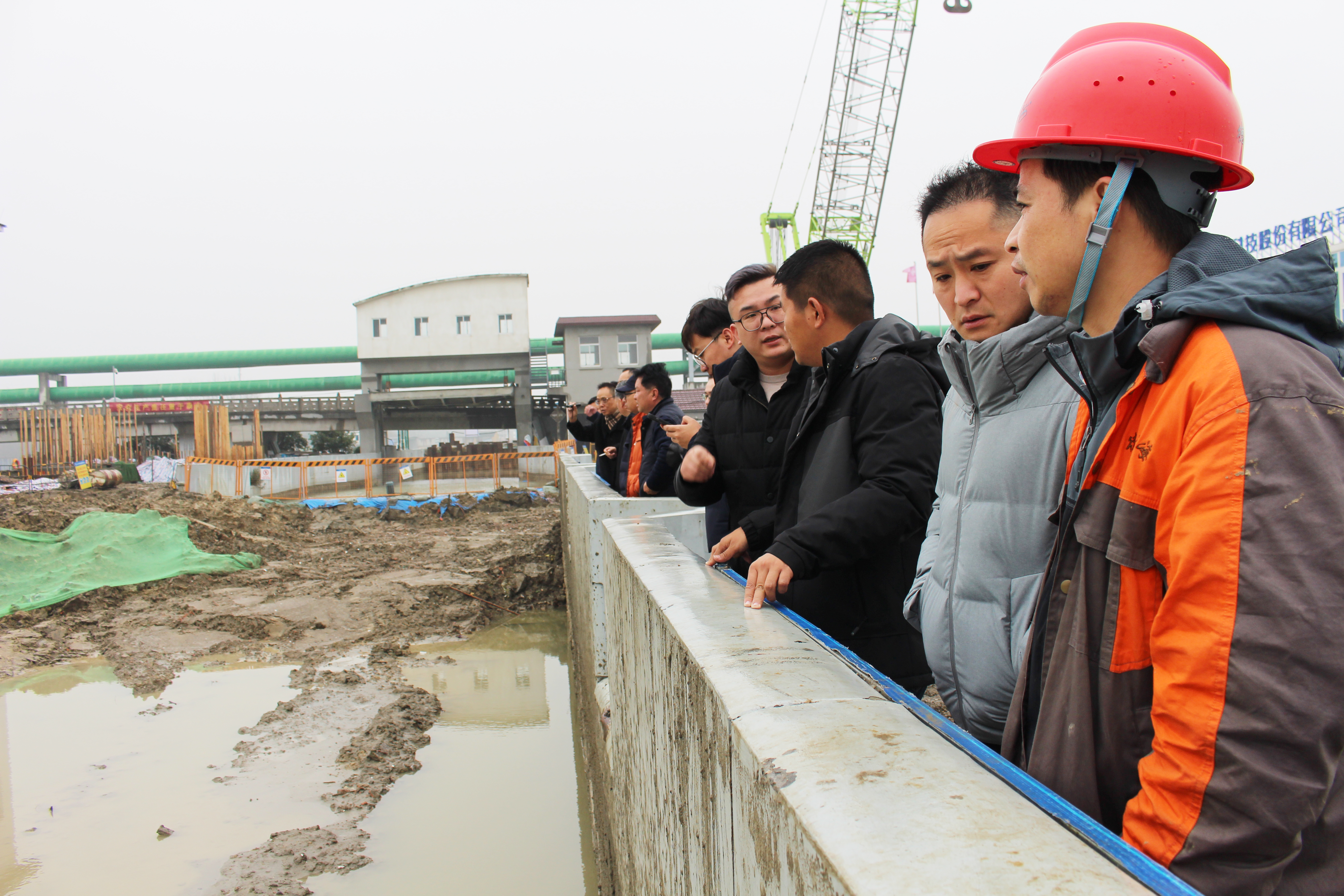 在高藻期蘇州城區(qū)水源保障工程(西塘河)項(xiàng)目現(xiàn)場,由現(xiàn)場負(fù)責(zé)人李長林帶領(lǐng)參會(huì)人員實(shí)地參觀項(xiàng)目建設(shè)情況,并介紹了項(xiàng)目概況、施工方法和項(xiàng)目進(jìn)度等信息。本項(xiàng)目為保障蘇州城區(qū)大包圍89平方公里范圍內(nèi)水源在高藻期不受藻類影響,不發(fā)生藍(lán)藻水華,需引望虞河水入西塘河,工程結(jié)合琳橋樞紐布置4口深潛式滅藻井(高壓滅藻器),井間距為15m,總引水流量規(guī)模不低于20m3/s,單座滅藻井管深度約100m、直徑3.2m、處理量5m3/s。項(xiàng)目地處臨河淤泥區(qū)域,作業(yè)場地狹小,針對(duì)本項(xiàng)目特殊作業(yè)工況,德林海采用直徑4m全套管搓管式鉆機(jī)、多功能履帶吊車+液壓抓斗成套設(shè)備施工工藝,攻克施工難關(guān),在保障工程順利推進(jìn)的同時(shí),完善了德林海施工工藝體系,不僅為德林海今后高速優(yōu)質(zhì)發(fā)展奠定了堅(jiān)實(shí)的基礎(chǔ),更充分體現(xiàn)出德林海人開拓創(chuàng)新、攻堅(jiān)克難的進(jìn)取精神。