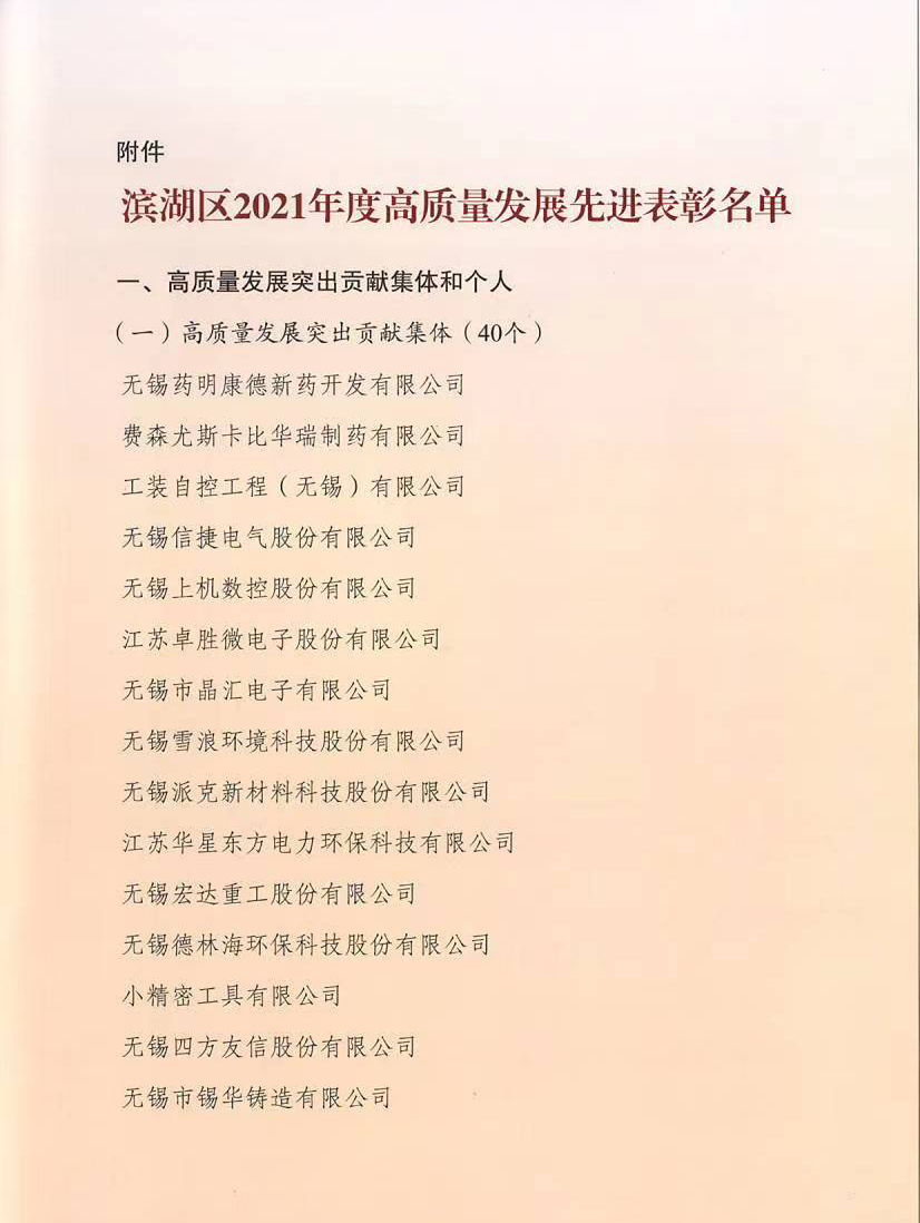 2022年5月4日,無錫市濱湖區(qū)委、區(qū)政府召開全區(qū)2021年度綜合考核總結(jié)表彰大會(huì),通報(bào)全區(qū)2021年度綜合考核(評(píng)價(jià))結(jié)果,對(duì)在區(qū)年度考核和一季度“擔(dān)使命作貢獻(xiàn)”季季評(píng)中表現(xiàn)出色的先進(jìn)集體和個(gè)人進(jìn)行表彰。無錫德林海環(huán)保科技股份有限公司被授予“高質(zhì)量發(fā)展突出貢獻(xiàn)集體”稱號(hào)。